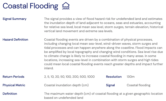 The Coastal flooding metric refers to the inundation of land connected to oceans, seas and estuaries. The coastal flooding signal shows the maximum water depth (in cm) of coastal flooding at a given geographic location based on undefended land. The signal is derived from relative sea level, local mean sea level, terrain elevation, historical vertical land movement and extreme sea levels. The greater the coastal flooding value (in cm), the greater the predicted water depth of a flooding event.