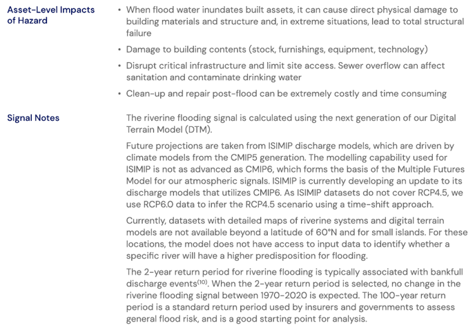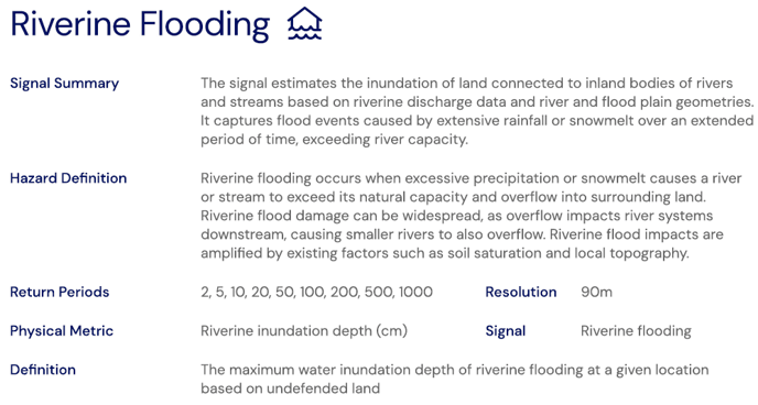 The Riverine flooding metric refers to the inundation of land connected to inland waters, such as lakes, reservoirs, wetlands, rivers and streams. The riverine flooding signal shows the maximum water depth (in cm) of riverine flooding at a given geographic location based on undefended land. The signal is derived from riverine discharge data and river and flood plain geometries. The greater the riverine flooding value (in cm), the greater the predicted water depth of a flooding event.
