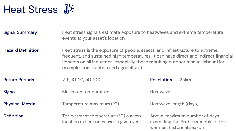 The Heat Stress Risk Category also incorporates historical and near real-time reanalysis from the ERA5 dataset from the ECMWF (European Centre for Medium-Range Weather Forecasts).