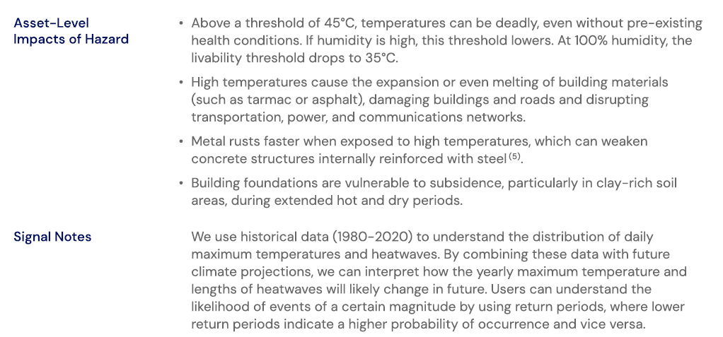 We determine asset-level exposure to heat stress by looking at three dimensions of change to these physical metrics: