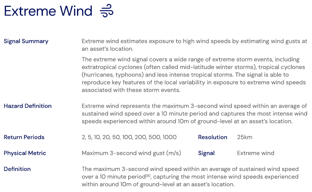 The extreme wind signal is derived using daily wind gust data (taken at 10m above the ground), which represents the maximum 3-second wind intensity per day. While the definition of “extreme” wind varies regionally, it is generally agreed that wind gusts are defined as sudden (yet brief) increases in wind intensity.