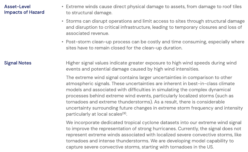 The Wind Risk Category in EarthScan is based on an extreme wind metric. The extreme wind signal shows the annual maximum wind intensity (in meters per second, ms-1).